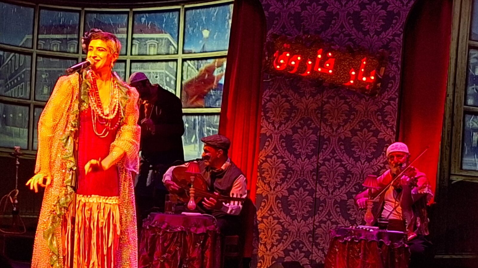 الأزياء والإضاءة شكّلت جزءاً لا يتجزأ من الهوية البصرية للعرض. التصاميم كانت انعكاساً أميناً للحقبة التي يعيد “بار فاروق” استحضارها، حيث استُخدمت ألوان وأنماط مستوحاة من أناقة الزمن الجميل. الإضاءة، بتدرجاتها المدروسة، أضافت بعداً درامياً جعل كل مشهد ينبض بروحه الخاصة، خاصة في اللحظات التي عكست صخب الحياة وتناقضاتها.