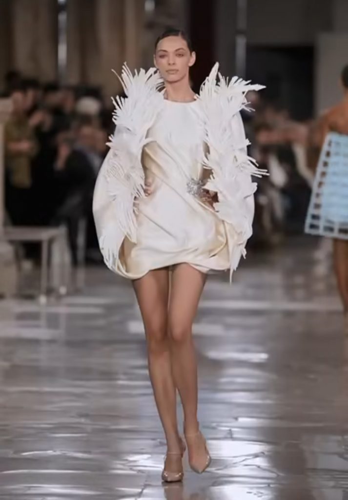 Georges Chakra’s show stood out for its sculpted silhouettes and dramatic details, combining rich fabrics with precise tailoring. Bold colors and innovative cuts gave the collection a striking impact, highlighting Chakra’s signature blend of modernity and Lebanese craftsmanship.